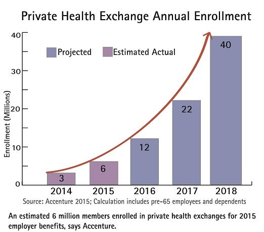 CHICAGO; April 7, 2015 – A new report by Accenture estimates 6 million people enrolled in private health insurance exchanges for their 2015 employer benefits. These findings show private health insurance exchanges – an online marketplace for people to choose their employer-sponsored benefits – doubled enrollment this year, up from 3 million in 2014.