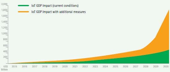 The report claims that, by taking additional measures to improve its capacity to absorb IoT technologies and increase IoT investment, China could boost its annual GDP by 1.3 percent by 2030, cumulatively adding US$1.8 trillion to the economy by that time (see graphic below).