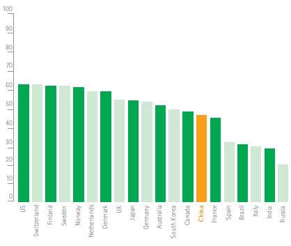 For these greater gains to be achieved, the Accenture analysis shows that China will need to significantly improve its capacity to diffuse IoT technology throughout its economy. In an international ranking of the strength of enabling conditions for the widespread use of the IoT, China comes 14 out of 20 leading economies (see graphc below).
