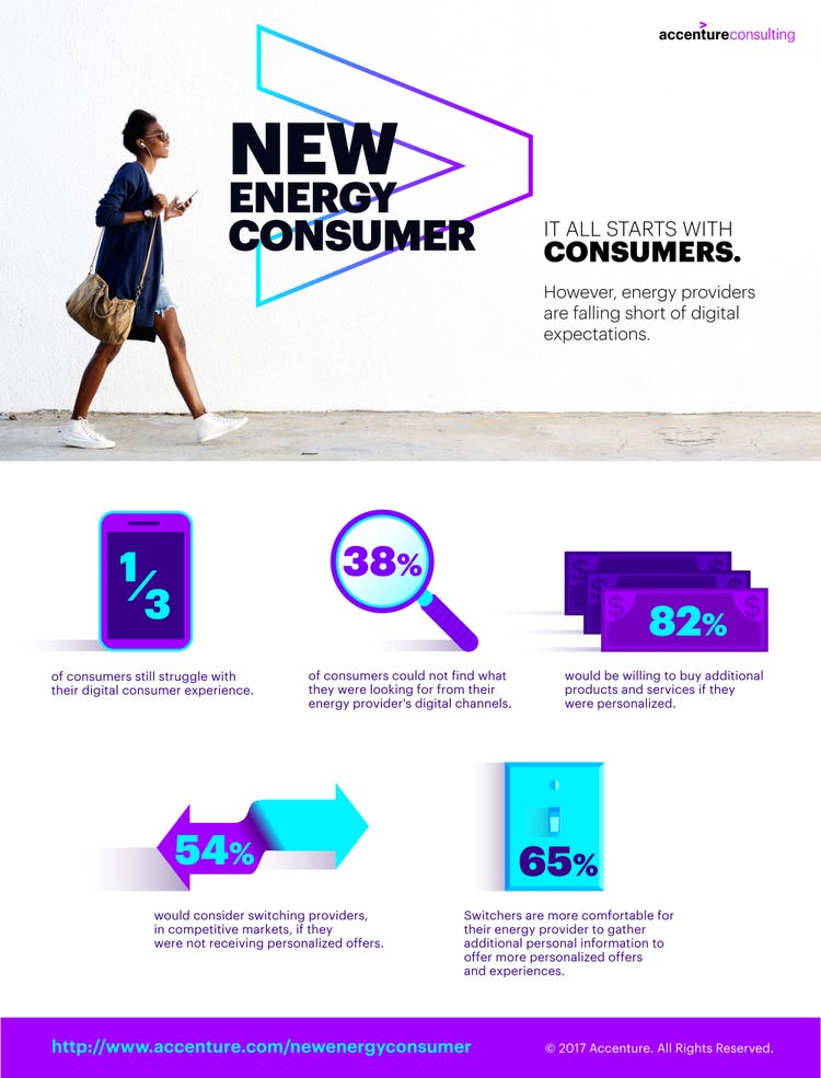 NEW YORK and LONDON; May 31, 2017 – Squeezed by falling profits, technology disruption and outside competitors targeting their customers, energy providers face the additional challenge of falling short of consumers’ expectations for digital channels and personalized experiences, according to the latest edition of the annual New Energy Consumer research by Accenture (NYSE: ACN).