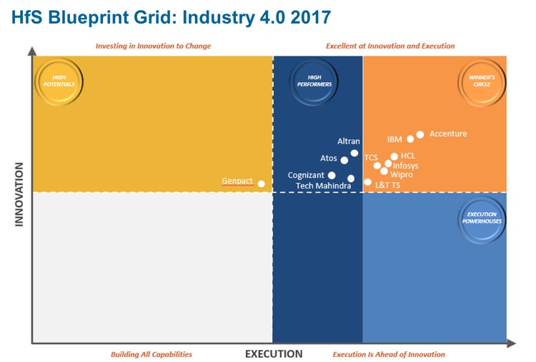 NEW YORK; May 11, 2017 – Accenture (NYSE: ACN) has been positioned in the “Winner’s Circle” as the leader in “innovation and execution” and in “investing in innovation” in the inaugural “HfS Blueprint Guide to Industry 4.0 Services.”