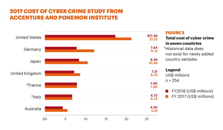 NEW YORK; Sept. 26, 2017 – Costly cyber attacks are having a significant and growing financial impact on businesses worldwide. According to new research published today by Accenture (NYSE: ACN) and the Ponemon Institute, in 2017 the average cost of cyber crime globally climbed to $11.7 million per organization, a 23 percent increase from $9.5 million reported in 2016, and represents a staggering 62 percent increase in the last five years. In comparison, companies in the United States incurred the highest total average cost at $21.22 million while Germany experienced the most significant increase in total cyber crime costs from $7.84 million to $11.15 million. This surge follows a recent string of infamous malware attacks including WannaCry and Petya, which cost several global firms hundreds of millions of dollars in lost revenues.