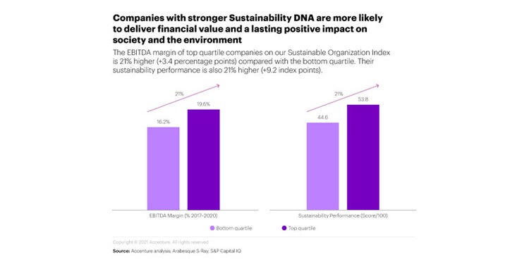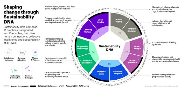 The report, Shaping the Sustainable Organization, finds that the responsible values and environmental, social and governance (ESG) intentions of companies are outrunning the ability of their organizations to deliver. To convert sustainability goals into reality, Accenture and the World Economic Forum decoded "Sustainability DNA," a set of 21 management practices, systems and processes that form the foundations of stakeholder-centricity.