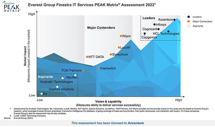 In the report, titled “Finastra IT Services PEAK Matrix® Assessment 2022,” Accenture is positioned as a Leader for both Market Impact and Vision & Capability. Everest Group cited Accenture’s broad Finastra services portfolio, strong global delivery capabilities, and its unique as-a-service solutions and accelerators in payments, lending, treasury and risk as strengths.