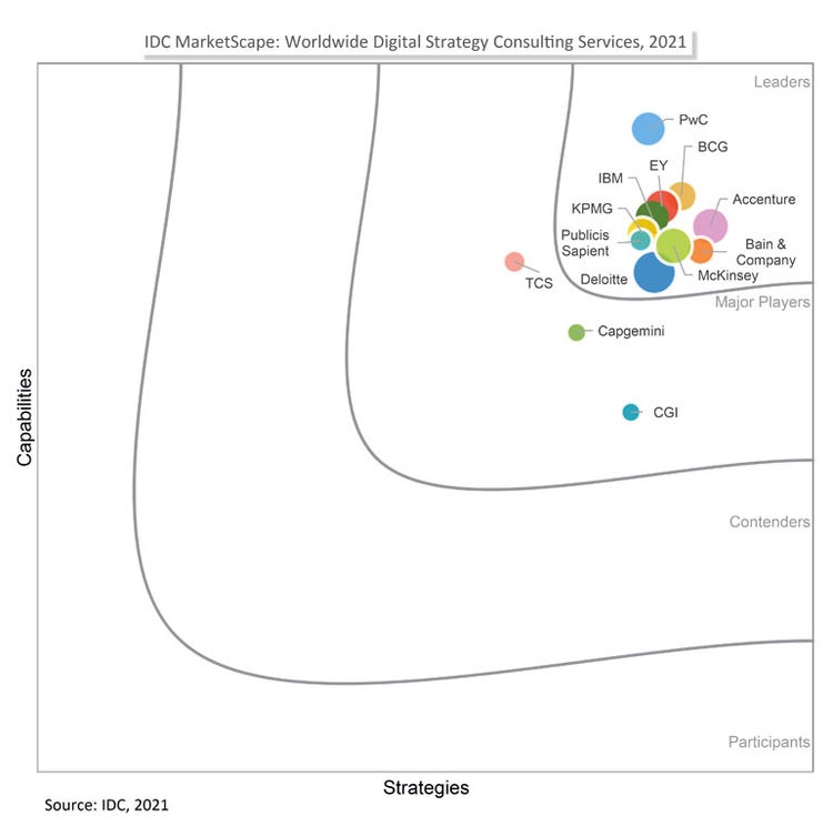 The report, “IDC MarketScape: Worldwide Digital Strategy Consulting Services 2021 Vendor Assessment,*" is a quantitative and qualitative assessment of the capabilities and business strategies of prominent digital strategy consulting services vendors. The study focuses on clients’ perceptions of the key characteristics and capabilities of each provider as factors conducive to success.