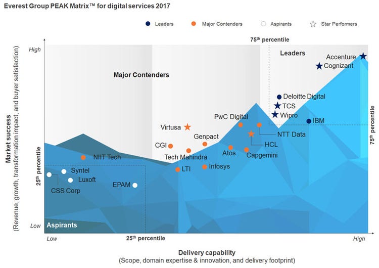 The report involves a competitive assessment of 22 leading service providers, each offering digital services in the required areas of Social, Cloud Apps, Mobility, Analytics and Big Data, Internet of Things (IoT) and Cognitive Intelligence. Measured against key criteria, including service offerings, investments, design studios, innovation and partnerships, each provider’s position on the PEAK Matrix™ is determined based on its overall success across the two dimensions of market success and delivery capability.
