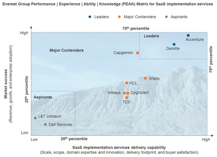 Accenture has also been positioned in the leading position in the inaugural Everest Group PEAK Matrix report focusing on Software as a Service (SaaS) implementation services, which profiled ten leading IT service providers. The PEAK Matrix is a framework to assess the relative market success and overall capability of service providers based on Performance, Experience, Ability and Knowledge (PEAK) in an industry.
