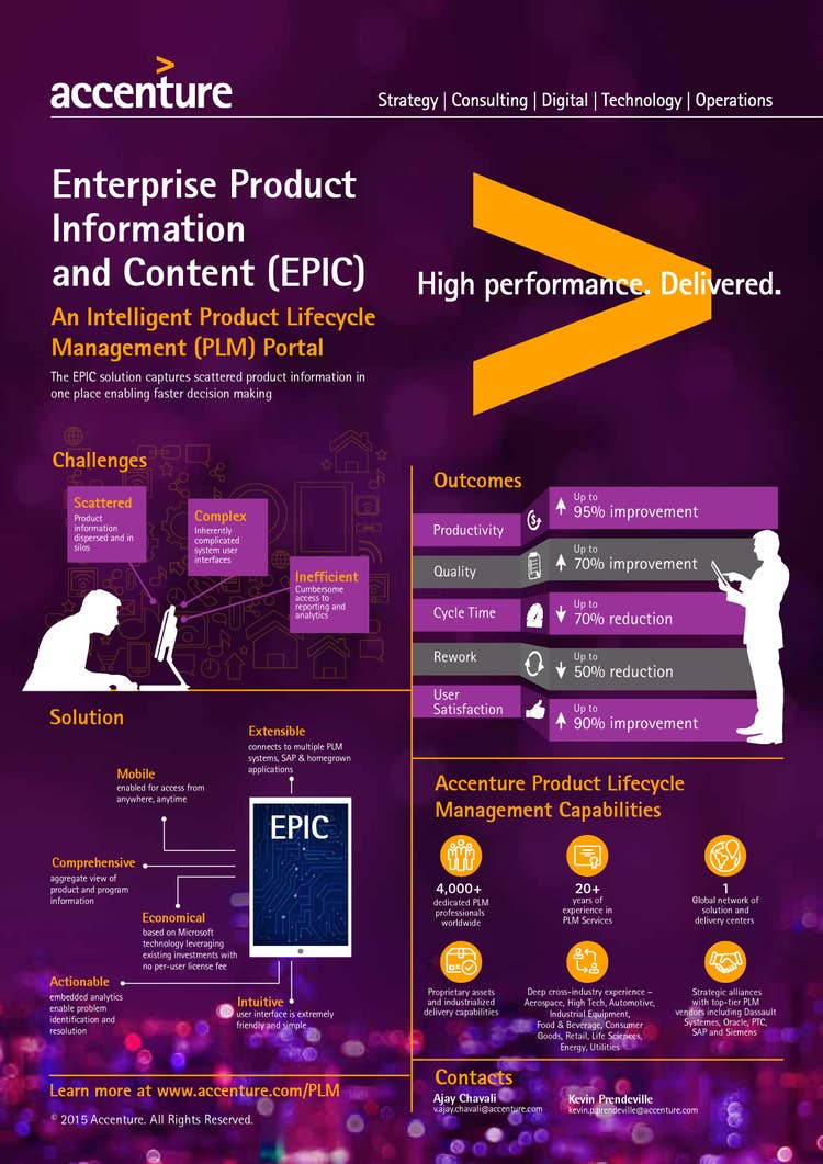Accenture developed the EPIC portal for companies that design, engineer and manufacture complex products in the aerospace, automotive, consumer products, electronics, industrial equipment, high-tech and life science industries. The portal features pre-defined integration with product lifecycle management, enterprise resource planning and a range of other applications used in product design and production.