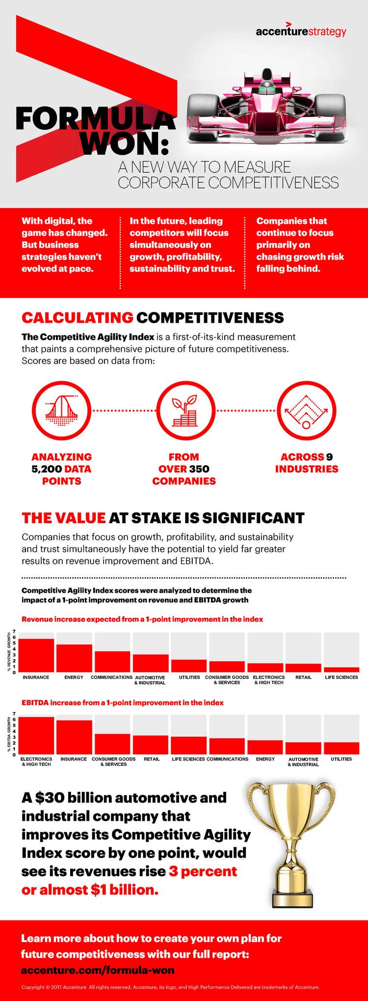 Accenture Strategy conducted the analysis and built the Index from a set of nine separate performance measures to create a forward-looking view on potential future competitiveness. The analysis shows that the companies best positioned for competitiveness have an interdependent strategy focused equally on growth, profitability and sustainability and trust.