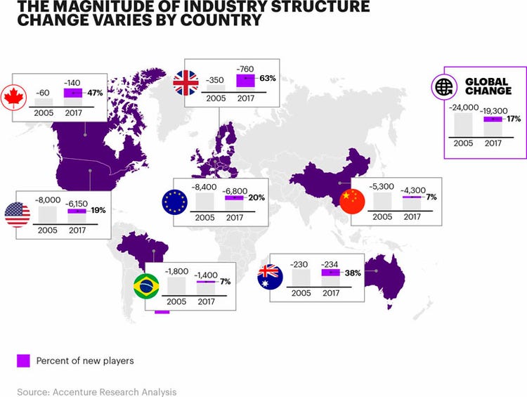 Accenture analyzed more than 20,000 banking and payments institutions across seven markets to quantify the level of change and disruption in the global banking industry. The study found that the number of banking and payments institutions decreased by nearly 20 percent over a 12-year period — from 24,000 in 2005 to less than 19,300 in 2017. However, nearly one in six (17 percent) current institutions are what Accenture considers new entrants — i.e., companies entering the market after 2005. While few of these new players have raised alarm bells among traditional banks, the threat of reduced future revenue growth opportunities is real and growing.