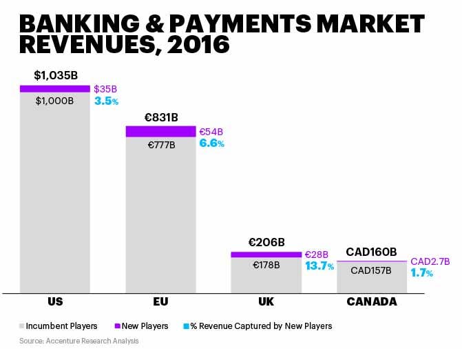 Canada: Investors have backed new entrants in Canada with the intention of disrupting the banking industry. While nearly half (47 percent) of banking and payments institutions are new entrants, they have captured less than 2 percent of total banking and payments revenue, making Canada one of the least disrupted major banking markets.
