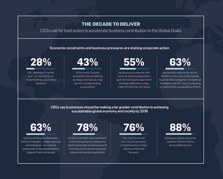 - Galvanizing ecosystems: CEOs must engage their broader business and technology ecosystems to find collective solutions to the SDGs. Given the nature and complexity of these issues, science-based leadership will play a crucial role in driving action and impact, as will applying technologies to instigate change.