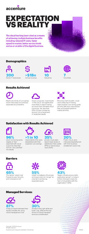 “Like most new technologies, capturing the intended benefits of cloud takes time; there is a learning curve influenced by many variables and barriers. Taking your cloud program to the next level isn’t something anyone can do overnight — clients need to approach it strategically with a trusted partner to access deep expertise, show measurable business value and expedite digital transformation,” said Kishore Durg, senior managing director of Accenture Cloud for Technology Services. “Also, if IT departments fail to showcase direct business outcomes from their cloud journeys, they risk becoming less relevant and losing out to emerging business functions, like the office of the chief data officer, that are better able to use cloud technologies to enable rapid innovation.”