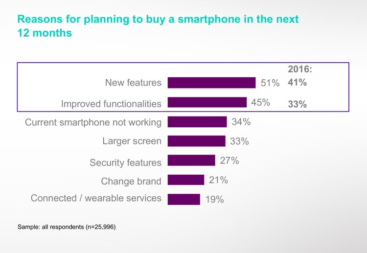 Among all consumers surveyed, the leading driver of purchase intent is the ability to access the newest and most innovative features and functions, cited by 51 percent of respondents in this year’s survey, compared with only 41 percent last year. Another reason consumers are opting to buy new smartphones is inadequate performance of their existing devices, cited by 45 percent of customers this year – up from 33 percent last year.