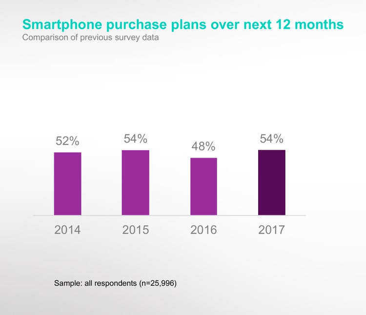 More than half (54 percent) of consumers surveyed said they plan to buy a smartphone in the next year, up from 48 percent in last year’s survey. Chinese consumers are the main drivers of this upturn, with three-quarters (74 percent) of respondents in China saying they intend to purchase a smartphone in the coming 12 months, up from less than two-thirds (61 percent) in last year’s survey. The number of respondents in India and the United States who said they plan to buy a smartphone in the coming 12 months also increased by double digits over last year, to 79 percent in India (from 68 percent last year) and 52 percent in the United States (from 38 percent last year).