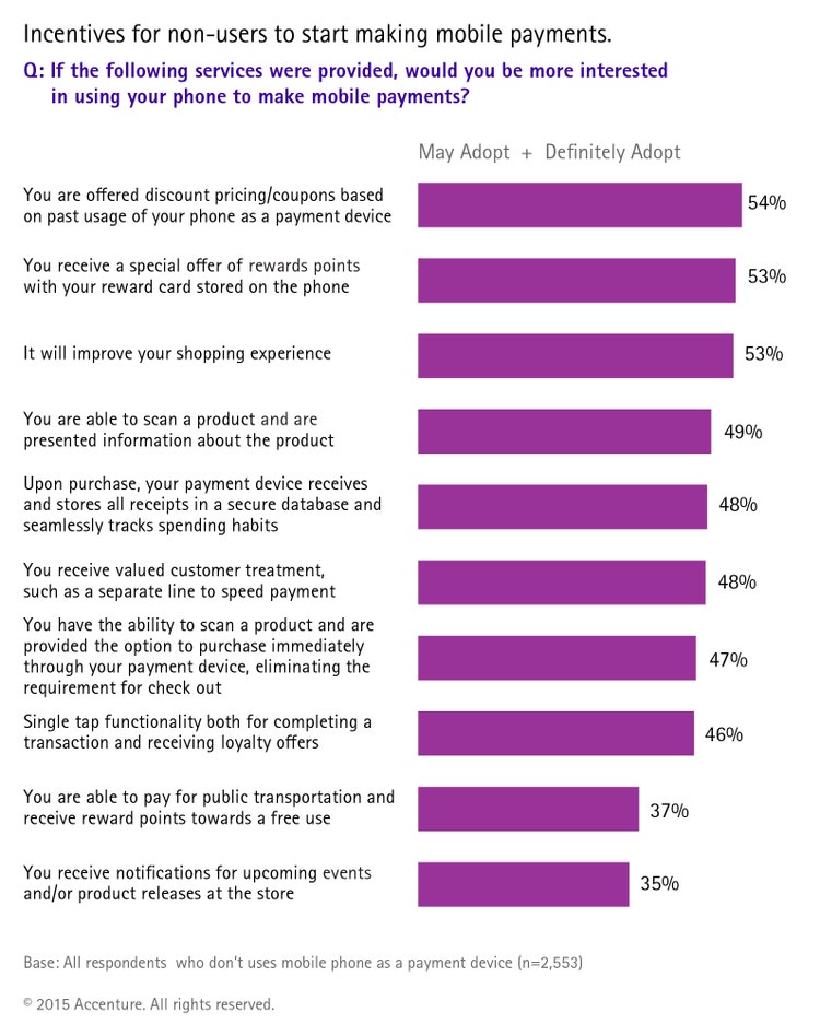 The survey also identified ways to increase mobile-payment adoption rates – namely, by giving consumers better security, incentives and rewards. More than three-quarters of consumers who currently make mobile payments said they would increase their usage if offered discount pricing or coupons based on past buying behavior (cited by 79 percent of users) and if they received reward points (cited by 78 percent). Additionally, more than half of those not currently making mobile payments would make them if offered discount pricing or coupons (cited by 54 percent of non-users) or reward points (53 percent).