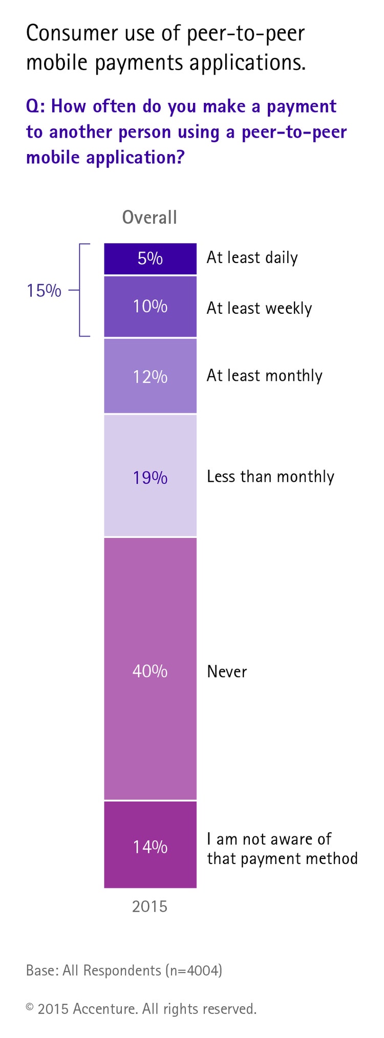 NEW YORK; Oct. 20, 2015 – Though mobile-payments awareness in North America has reached a tipping point – with more than half of consumers aware that they can make payments through their mobile phones – fewer than one in five North Americans (18 percent) use their mobile phones to make at least one payment a week, according to a new report from Accenture (NYSE: ACN).
