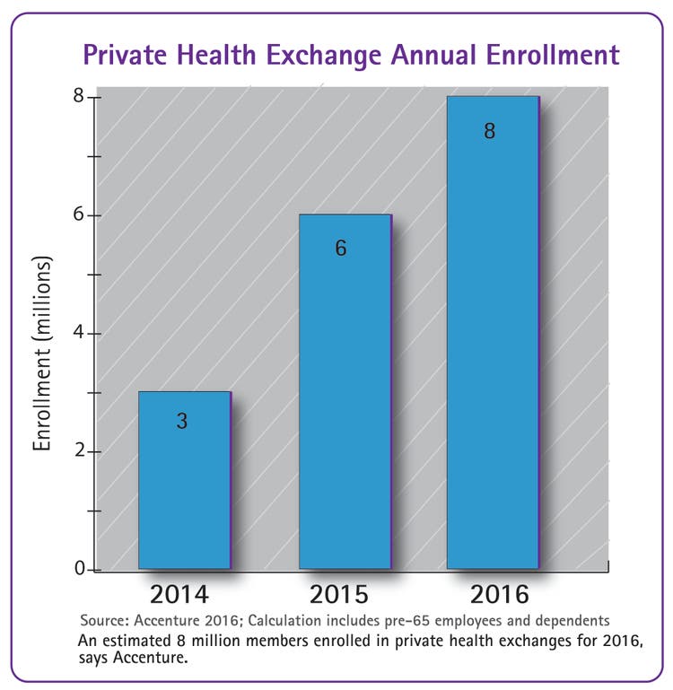 CHICAGO; Jan. 20, 2016 – A new report from Accenture (NYSE:ACN) estimates that the number of people who enrolled in private health insurance exchanges – an online marketplace for people to choose their employer-sponsored benefits – for 2016 increased 35 percent from last year, to approximately 8 million, up from [approximately] 6 million in 2015.