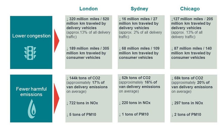 The study also found that deploying route optimization technologies alongside MFCs could reduce delivery traffic by an additional 3% to 4% across the three cities. The additional reduction in vehicle travel would be highest for London (87 million miles, or 140 million kilometers), followed by Chicago (38 million miles, or 61 million kilometers) and Sydney (34 million miles, or 54 million kilometers).