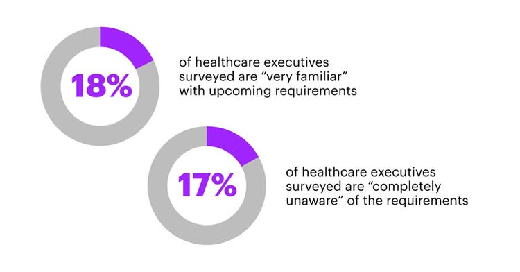 Fewer than one in five (18%) of the executives surveyed in key leadership positions at U.S. healthcare companies said they are “very familiar” with the new regulations, while 17% said they are completely unaware of it. Around 53% said they are “somewhat familiar,” with 12% “vaguely familiar.”