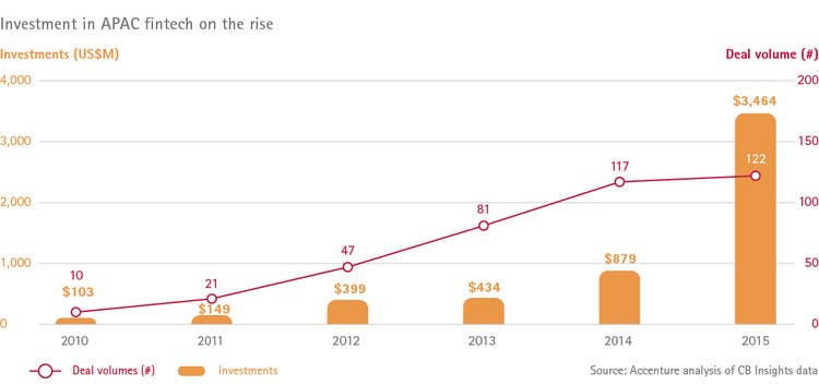 HONG KONG; Nov. 3, 2015 – Investments in financial technology (fintech) across Asia-Pacific skyrocketed in 2015 – from about $880 million in all of 2014 to nearly $3.5 billion in just the first nine months of 2015, according to a new report by Accenture (NYSE: ACN).