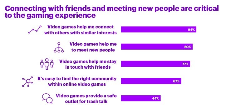 As the gaming community continues to grow, the social aspect is an increasingly key aspect to gamers’ overall experiences. 84% of respondents say video games help them connect with others with similar interests, while three-quarters of them recognize that more of their social interactions now happen on gaming platforms.