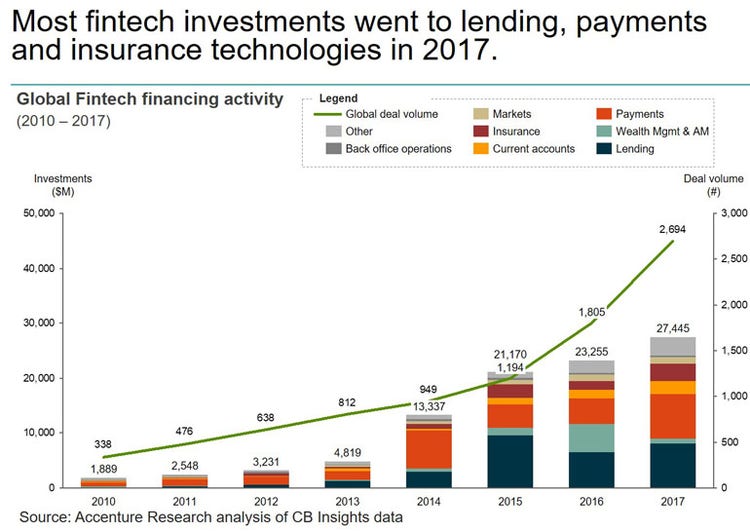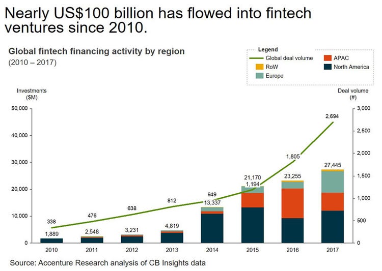 Total global investment in fintech ventures between 2010 and 2017 reached US$97.7 billion, with U.S. startups accounting for more than half (54 percent) of all investments. The volume of fintech deals globally within that timeframe grew at a compound annual rate of 35 percent, with total funding growing at a compound annual rate of 47 percent.