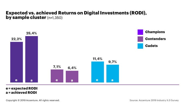 The best-performing companies in the sample scale more than 50 percent of their PoCs. They also expect much higher returns from their efforts than their peers. Most importantly, they tend to not only meet these high expectations — but to exceed them. Accenture’s research found that, on average, Champions expected a Return on Digital Investment (RODI) of 22.3 percent — but realized 25.5 percent.