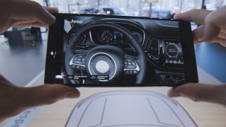 The Jeep Compass Visualiser allows car buyers to hold a Tango-enabled device and view, walk around, look inside and configure a life-size virtual car. External colors and wheel options can be selected and interchanged. Doors can be opened to reveal a realistic and detailed interior, where changes to upholstery colors can be made with a tap on the device screen. As the car is viewed through the device, the virtual car moves in relation to how the user moves.