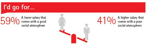 Compounding the challenges for Britain’s largest employers, the Accenture Strategy survey found that organizational culture continues to be important. A majority (59 percent) of the 2015 class say that they would prefer to work at a company with a positive social atmosphere and receive a lower salary, than receive higher pay at a company that is less fun. Fifty two percent would accept a lower salary if a company displays a commitment to environmental or social impact.