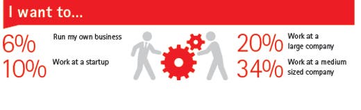 Only one fifth of 2015 graduates surveyed say they would prefer to work for a large company. Instead, a third (34 percent) would opt for medium sized enterprises, 11 percent would go for a Government job, and almost a fifth would prefer to work for an entrepreneurial company or start-up, a non-profit organization or to work independently.