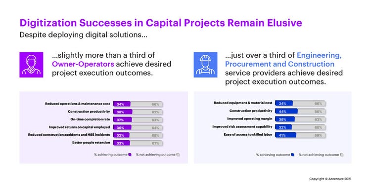 Other findings paint a similar picture, with 75-89% of the owner-operators and EPCs using data, data-driven insights and digital applications to better mitigate risk and increase project efficiency or execution, but only 32-44% achieving their set goals. The reasons, the report notes, are a strategic failure to build the right operating environment and incentives to create a data-centric culture, and an inability to operationalize data and technology.