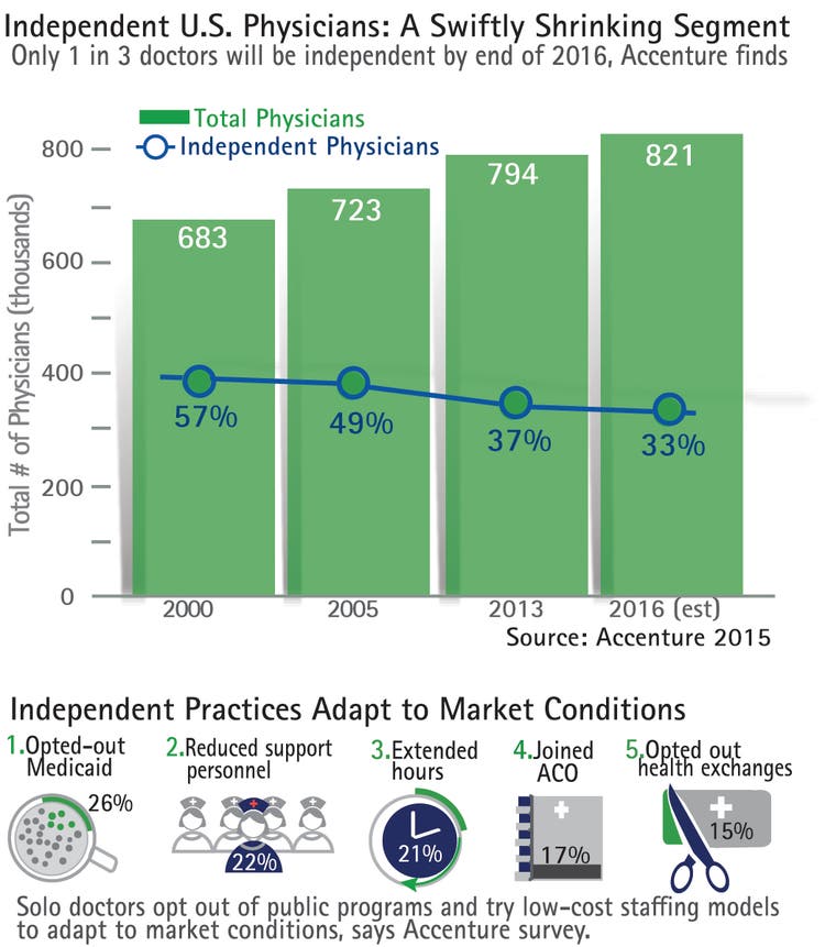 “Independent practices need business models that are as unique as the market they serve,” said Kaveh Safavi, global managing director of Accenture’s health business. “There’s increasing complexity with running an independent practice and requires that doctors differentiate by specialty type, size or in personalizing service options, such as remote consultations or same-day appointments. Doing so will help independent physicians stay relevant and profitable.”