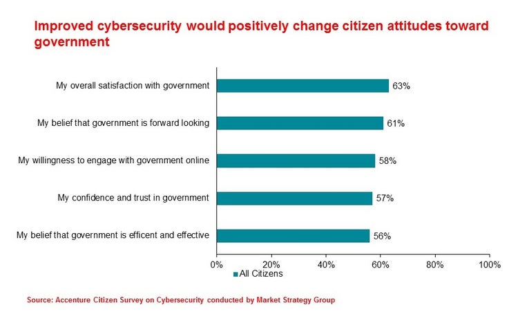 The survey found that, despite citizen concerns about cyber threats, improved cybersecurity and data-protection measures could improve citizens’ attitudes toward government. Almost two-thirds (63 percent) of respondents said that increased data-security measures would increase their satisfaction with government agencies, and more than half said that improved data-security measures would increase their willingness to interact with government agencies and their confidence and trust in those organizations (cited by 58 percent and 57 percent, respectively).