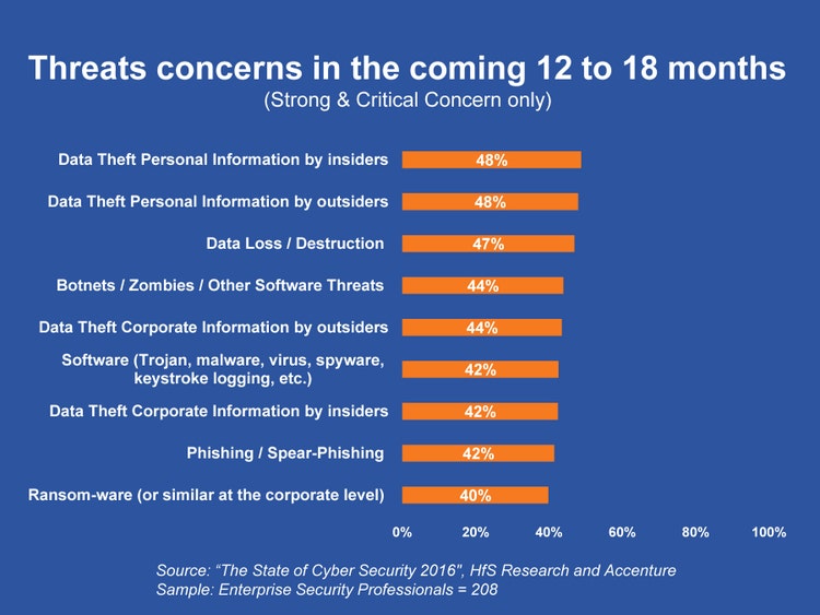 NEW YORK; June 27, 2016 – Insider data theft and malware attacks top the list of the most significant concerns for enterprise security executives, a new report from Accenture and HfS Research reveals. Of those surveyed, a majority (69 percent) of respondents experienced an attempted or successful theft or corruption of data by insiders during the prior 12 months, with media and technology organizations reporting the highest rate (77 percent). This insider risk will continue to be an issue, with security professionals’ concerns over insider theft of corporate information alone rising by nearly two-thirds over the coming 12 to 18 months. Additionally, the research shows that a budget shortage for hiring cybersecurity talent and well-trained employees is hindering the ability of organizations to properly defend themselves against these attacks.
