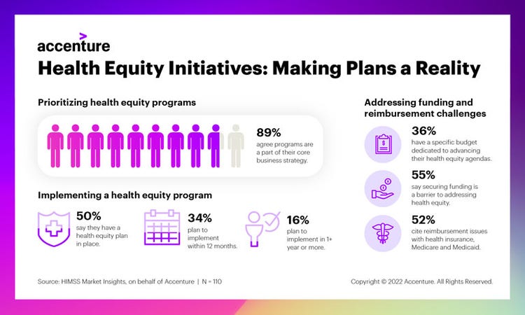 NEW YORK; March 15, 2022 – New research from Accenture (NYSE: ACN) and HIMSS Market Insights reveals that 93% of U.S. healthcare executives believe that health equity initiatives are important and 89% agree that such initiatives are part of their core business strategy. However, only slightly more than a third (36%) have a specific budget dedicated to advancing their health equity agendas.
