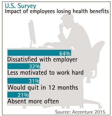 CHICAGO; June 15, 2015 – Employers who fail to fully sponsor their employees’ health benefits would face widespread employee dissatisfaction, lower employee productivity and the loss of nearly a third of their employees within one year, according to new research by Accenture (NYSE: ACN).