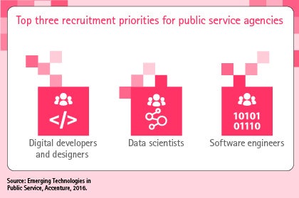 ARLINGTON, Va.; Feb. 2, 2017 – Public sector agencies must adopt emerging technologies – including machine learning, artificial intelligence and biometrics – to attract and retain more technically adept employees. This approach is critical to addressing a widening skills gap and strong competition from a better financed private sector, a new report from Accenture (NYSE: ACN) shows.