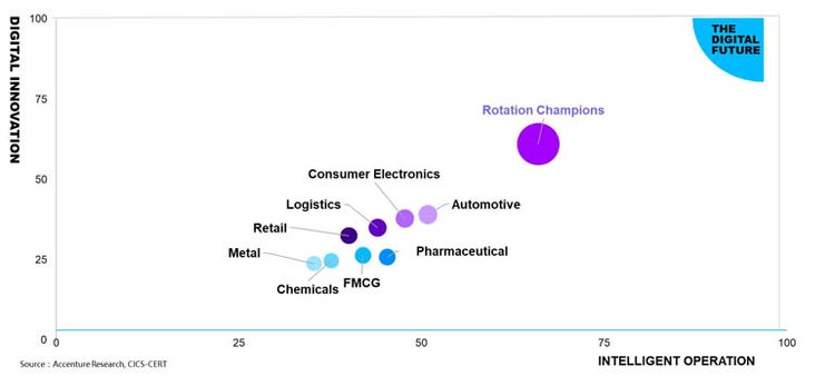 The report, the China Digital Transformation Index, revealed that seven percent of Chinese companies have become what Accenture refers to as “Rotation Champions” by generating more than half of their revenues from new businesses started in the last three years. This at a time when traditional growth efforts are too partial and fragmented to make a real impact in digitally contested industries.