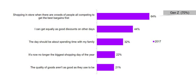 Approximately two-thirds (64 percent) of those who said they don’t plan to shop on Black Friday cited the crowds of people competing for bargains as the reason. Another reason for the expected drop in shopping during the peak holiday shopping days: year-round bargain buying. Nearly two-thirds (64 percent) of consumers said they shop for holiday gifts throughout the year, with the rise of constant discounts like deal websites and Amazon Prime Day. In fact, more than four in 10 respondents (44 percent) cited the ability to get equally good discounts other days of the year as one reason they’re less inclined to shop on Black Friday.