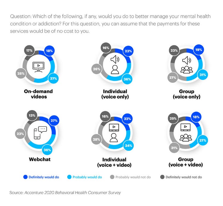 Among the channels respondents said they’d be willing to use include on-demand videos (cited by 55%), webchat (63%), individual therapy via voice (59%) and individual therapy via voice plus video (56%).